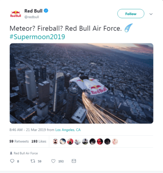 紅牛公司的官方推特隨後也發了一條消息:“隕石?火球?(都不是,)是紅牛空軍。#超級月亮2019”