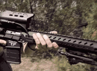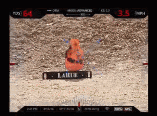 第二步,射手按動扳機前方的一個紅色的“鎖定”按鈕,通過內置的激光發射器光點瞄準,並鎖定目標,鎖定目標之後系統會自動在顯示屏上顯示目標身上的光點,即便位置移動也會隨之移動,保證瞄準點一直在原位,此時火控系統會根據傳感器檢測到的各種信息,迅速計算出彈頭風偏和彈道下墜的幅度等等,並根據計算結果修正出合適的落點,這個落點和實際落點之間相差極小,在0.047 MOA範圍內。