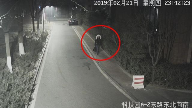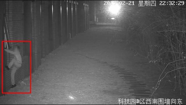 視頻顯示:發現前一天晚9點,有一名嫌疑男子進入科技園內,鬼鬼祟祟,行跡十分可疑。夜晚11時,他又出現在科技園內,不僅身上多了一個挎包,還更換了外套,身上所穿的羽絨服和事主丟失的一模一樣。