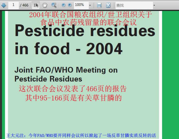 **3. CODEX(國際食品法典委員會)的評估。**2004年CODEX(國際食品法典委員會)對草甘膦的安全性做了一次全面的評審,批准了草甘膦重新註冊為低毒除草劑使用。結論是草甘膦安全。下面是聯合國世界衞生組織和糧農組織在2004年對經過10年田間使用後的草甘膦安全性做了一個新的評估。這個報告有466頁,其中有關草甘膦的再評估有70頁。