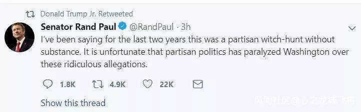 比如他一邊轉發了下面這段美國共和黨參議員蘭德⋅保羅斥責“通俄門”調查就是對特朗普的“獵巫行動”的文字…..
