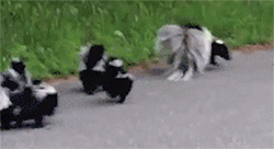 除此以外,臭鼬恐怕是北美最經常被車撞死的動物。它們大搖大擺的行為面對汽車的時候是致命的——當汽車飛馳而來時,臭鼬總是把它們當成一個巨大的捕食者,想着臭死汽車,給它們來點教訓。