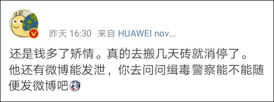 但也有網友這時候提及了他懺悔改正的過往:“毒戒了嗎?”這讓柯震東忍不住反擊“早戒了!你個智障!”面對另外一位網友指責咎由自取,他以反話方式回應“哈哈哈哈哈”,感覺精神似乎確實到了最緊繃的狀態。