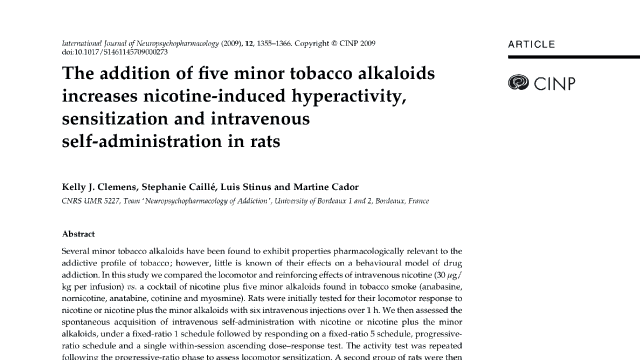 法國波爾多大學的研究團隊發現,相比單純的尼古丁,把尼古丁和煙草中其他五種物質混合,更能增加老鼠的過度活躍。尤其是新煙草鹼、可替寧和麥斯明,可以增強尼古丁活性,促進吸煙行為。