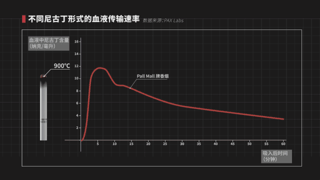 這主要是因為遊離鹼尼古丁需要藉助香煙中可達 900℃ 的高温才能充分釋放,而在霧化温度只有 200℃ 左右的電子煙中效果遠不如尼古丁鹽。