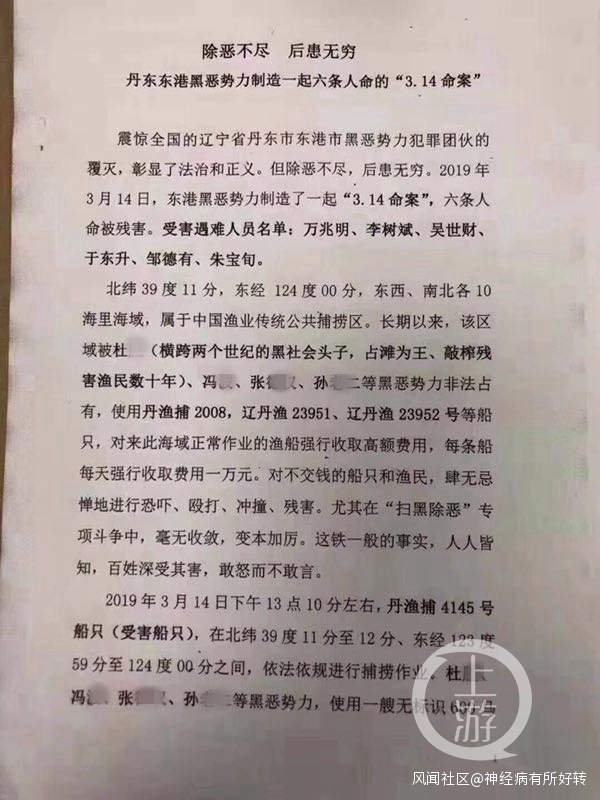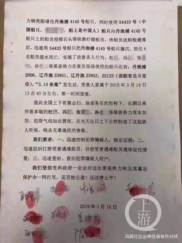 上游新聞記者獲得了一份在網上流傳的《除惡不盡,後患無窮,丹東東港黑惡勢力製造一起六條人命的“3·14命案”》家屬請願書。經瞭解,這份請願書是幾名失蹤船員家屬所寫,在請願書末尾,有家屬簽名並按有指印。