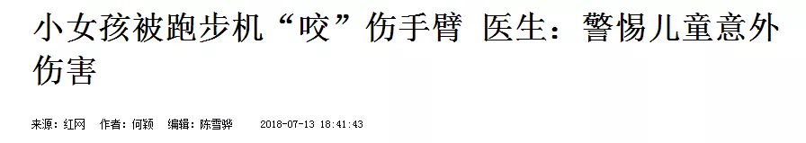 家裏安裝運動器械的,也要提醒孩子不要在上面玩耍,以免出現意外。生活中就有這樣的事例,三兄妹坐在跑步機上玩耍時,觸碰到電源開關,乍然運行的跑步機履帶將孩子的手臂整個“吞”了進去,右上臂整塊皮膚被“撕掉”。