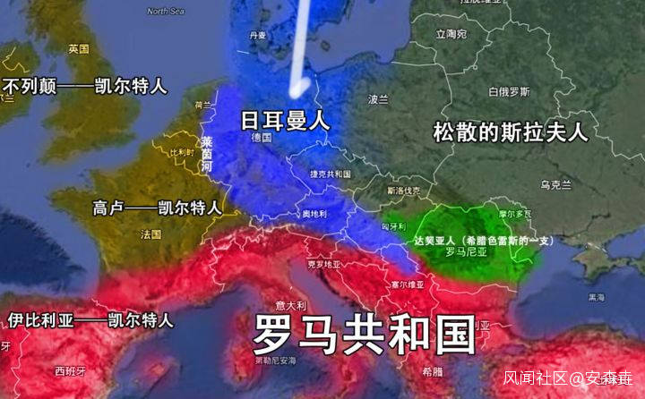 圖 凱撒吞併高盧阻擋日耳曼人,隨着凱撒死後羅馬控制不列顛,凱爾特人除了愛爾蘭和高盧西北角的一點殘餘幾乎全部羅馬化,綠色的希臘色雷斯遺民之後也被羅馬控制,這也就是羅馬尼亞的前身,地中海沿岸除了只敢抱羅馬大腿的托勒密王朝已經幾乎全部被羅馬佔領。可是這個是日耳曼人又開始滲入到斯拉夫人的地盤波蘭一帶,羅馬和日耳曼人無休止的對抗也即將拉開帷幕。