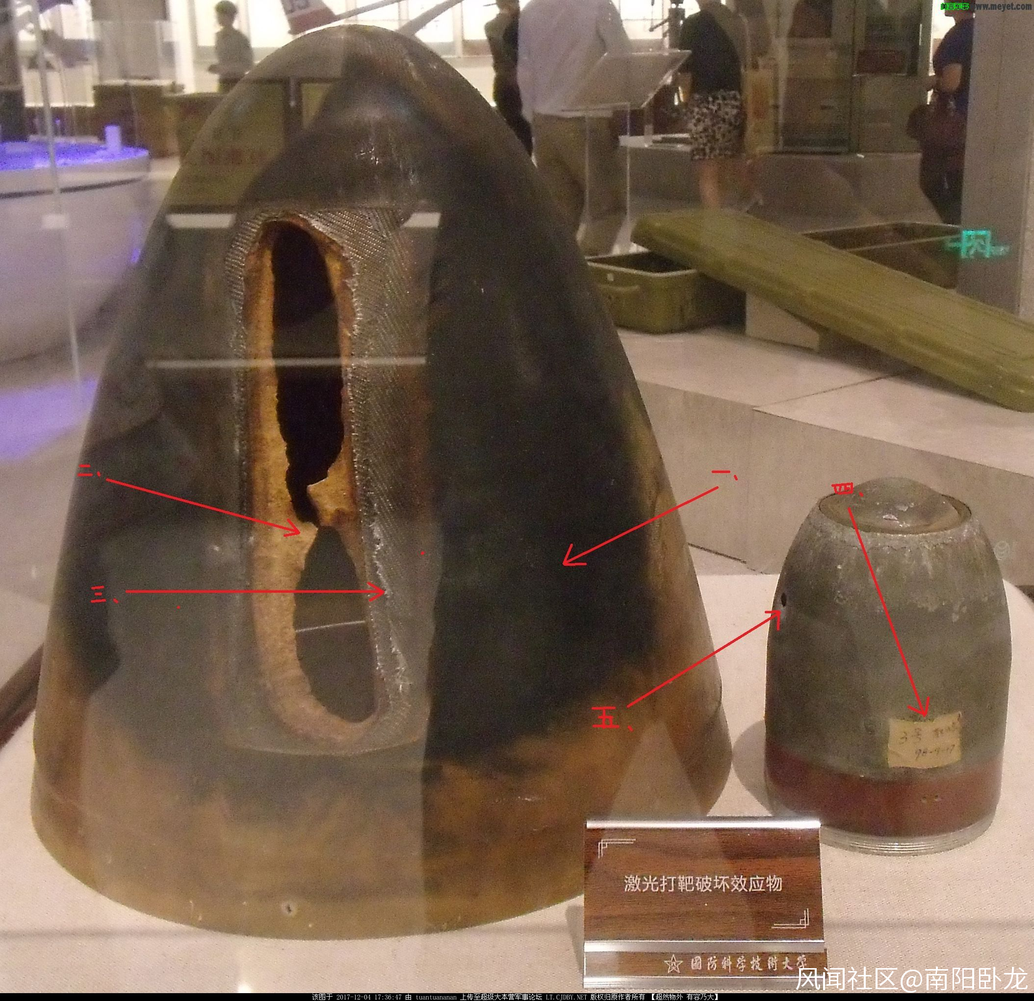 這是國防科技大學展出的中國激光打靶效果實物。無論是左側的彈道導彈彈頭和右側的普通炮彈,都有明顯的激光破壞力。注意上面的紅色箭頭。