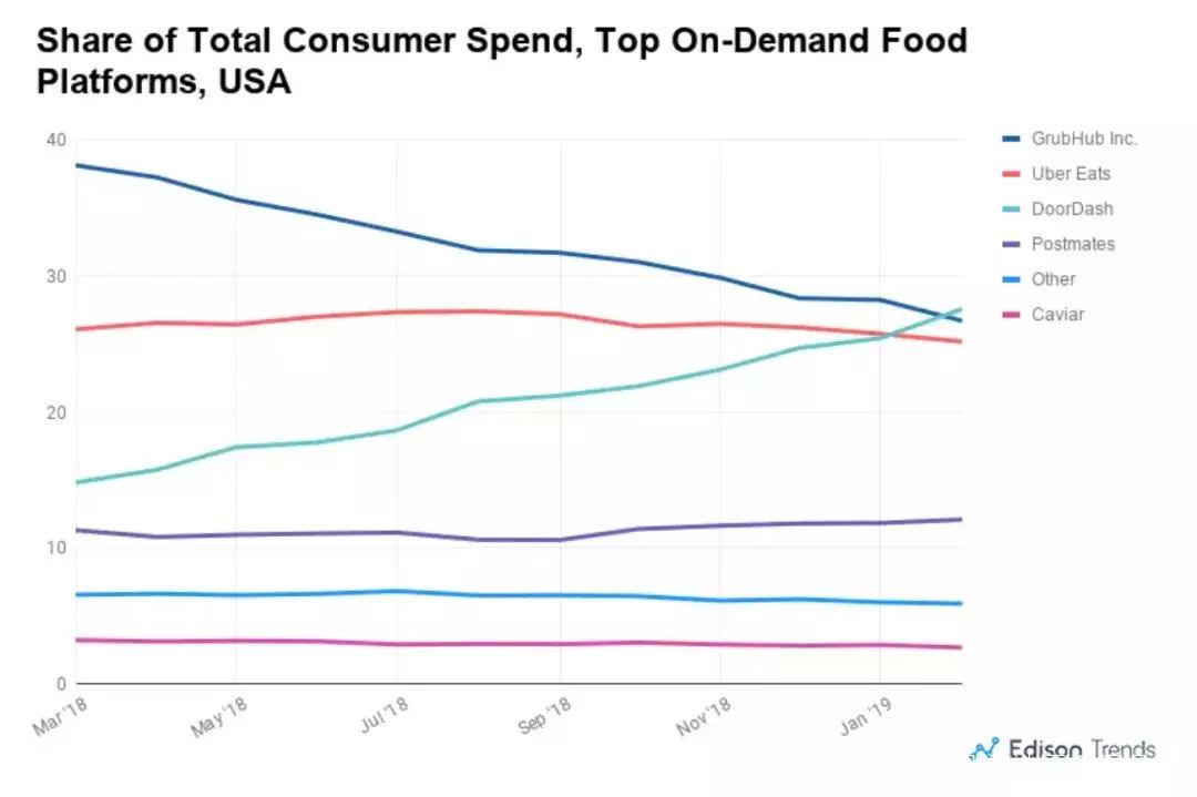 根據第三方研究公司Edison Trends週一公佈的數據,Doordash在消費者支出市場份額上擊敗了傳統的領導者Grubhub,如今已成為頂級食品配送服務商。