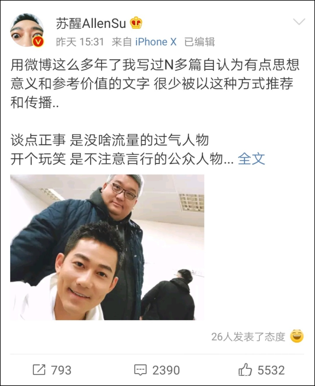 還有粉絲説,網絡上比甦醒這條微博文案更過分、更低俗的內容比比皆是,不知道網友一頓猛轟甦醒是出於什麼目的。而且像是甦醒這樣程度的葷段子,其他藝人在公開場合也會講,甚至有些還經由視聽節目公開傳播,歸根到底還是看臉?