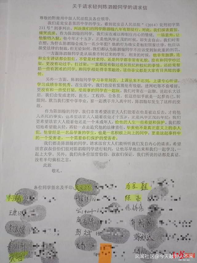 陳泗翰同校55名初三學生自發聯名向法院寫了一份《關於請求輕判陳泗翰同學的請求信》。聯名信中寫到,希望法院“看到他是被迫反擊,才將人殺死的事實”,對陳泗翰從輕判罰。