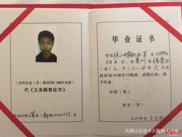 ▲案發後,甕安四中仍為陳泗翰頒發了畢業證書