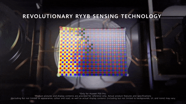 餘承東在現場介紹,P30系列世界首次用了RYYB紅黃黃藍濾光陣列組合,白色是綠光和紅光的結合,進光量提升70%,感光元件比其他同類產品大125%尺寸,跟上一代相比,P30系列的光圈也從1.8提升到1.6,暗光拍照更強。