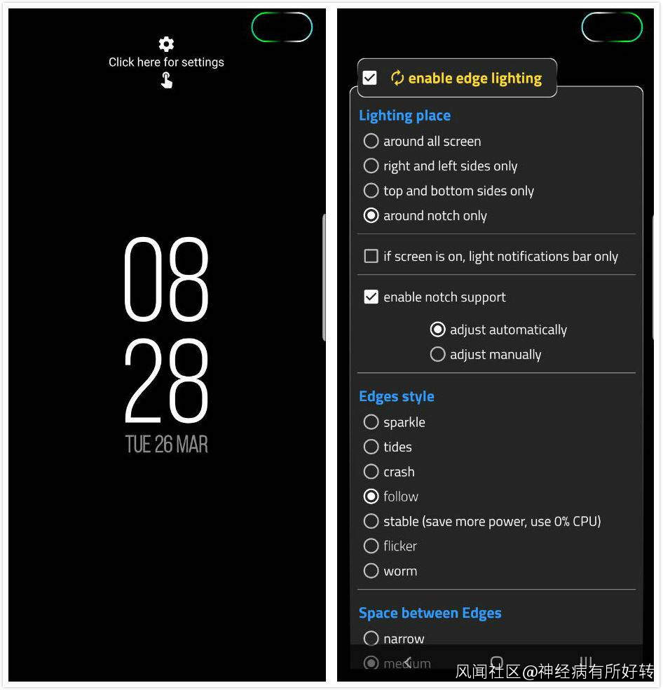 開發者的創意還不止於此。利用和 Energy Ring 類似的原理,Always On Edge 還可以讓開孔變成「呼吸燈」。這個應用本來的功能是讓三星 AMOLED 屏幕顯示「跑馬燈」,在息屏狀態下,手機四周可以顯示炫酷的彩色線條,配合黑得更純粹的 OLED 屏,效果十分不錯。