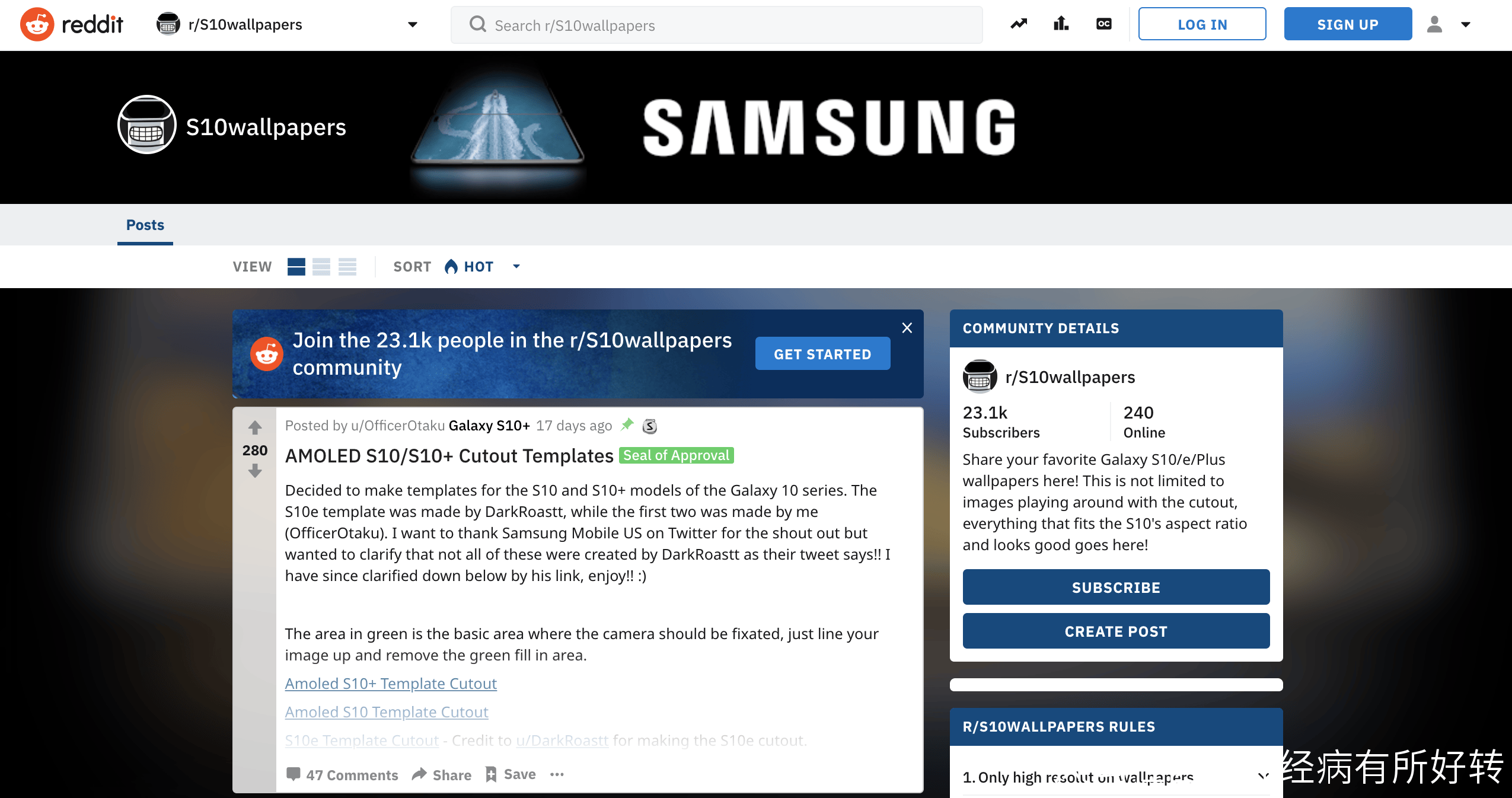 最早這樣做的是 Twitter 用户 @Matt B,他先用三星 S10 渲染圖進行效果展示,在網絡上獲得了強烈的反響。之後 Matt B 把這些壁紙製作了出來,並放到網上。這一行為引來大量的圍觀和模仿,Reddit 社區專門建立了一個 S10 wallpapers 的版塊,讓網友們展示和交流創意。