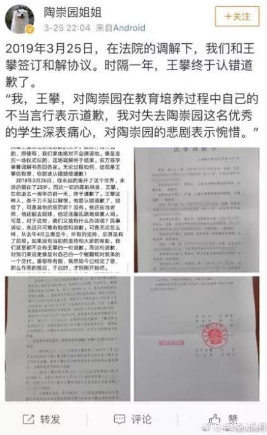 3月25日晚,陶崇園的姐姐陶小慶發佈微博:“時隔一年,王攀終於認錯道歉了。”
