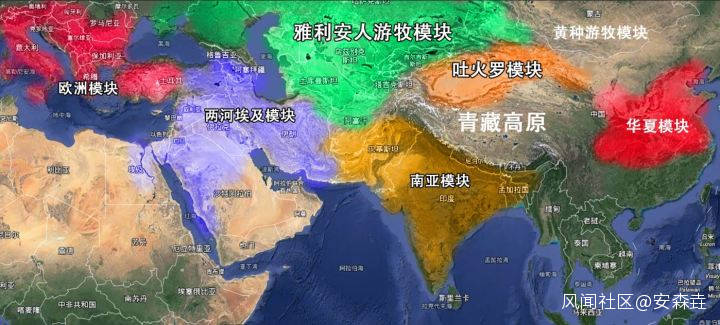 圖 印度次大陸(南亞模塊)位置,可以看出來這個地方要是説開放,其實是很開放的,北邊是綠色的白種人雅利安遊牧民族,東邊還有橙黃色的白種人吐火羅人,西邊是富庶的兩河流域再往西就是高度發達的地中海,這可以説是處在文明交匯點的一個地理位置。但是説到閉塞也確實閉塞,他們北邊是“世界屋脊”帕米爾高原和青藏高原,西邊是伊朗高原,南邊是大洋,可以説這地方實際上又被高山大海隔絕了起來,成為了一個相對獨立發展的文明,當然了這個地方大部分都處在熱帶亞熱帶,氣候也很炎熱,所以兩條河流成了滋潤這個區域的重中之重。