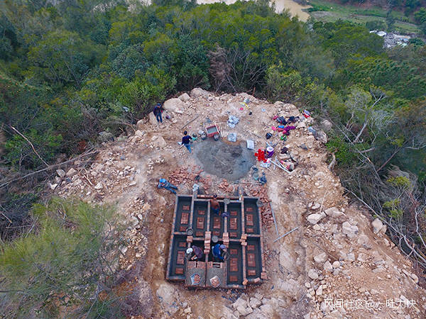 福清市城頭鎮溪邊村一處山上幾位工人在建造活人墓(3月14日無人機拍攝)。