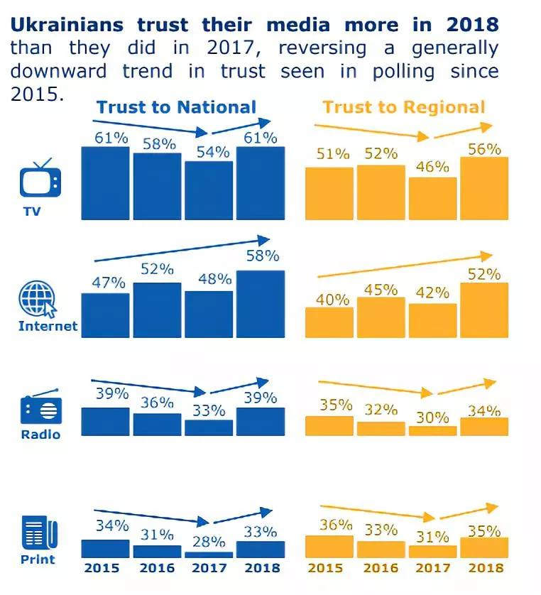 也是因為“獨立性”有待商榷,媒體分析師Taras Shevchenko表示,其實烏克蘭的電視新聞也是“假新聞來源之一”。不過,關鍵是,即使在網絡信息非常發達的今天,烏克蘭民眾對於電視台的依賴和信任依舊非常高。