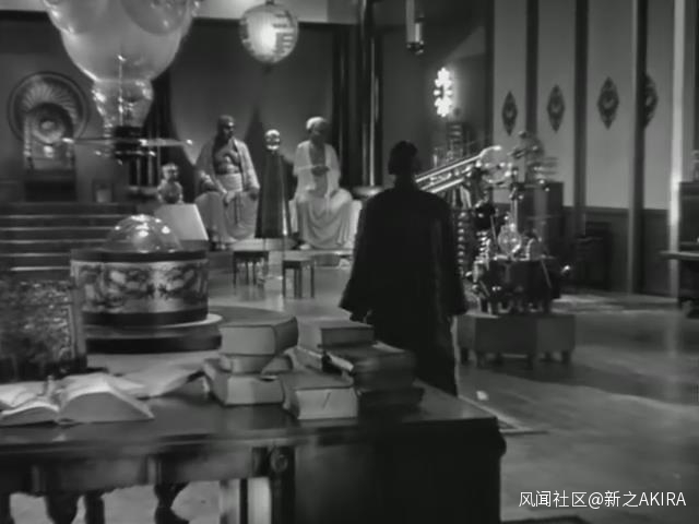 於是我們可以看到傅滿洲辦公室的全貌,有書,有科學儀器,也有一個非常東方化的寶座和巨大的佛像: