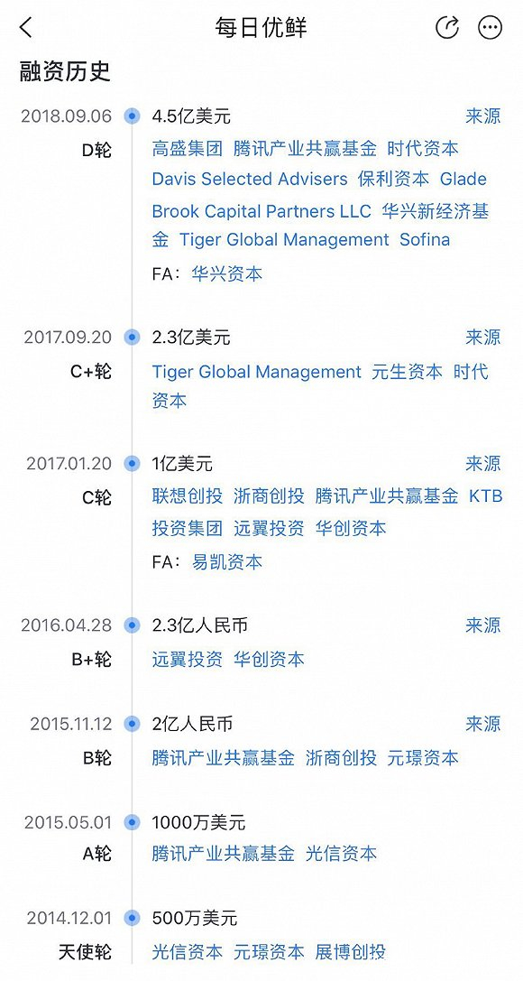成立5年來,每日優鮮已經陸續完成了7輪融資。最近一輪融資是去年9月完成的,總金額達4.5億美元,領投方包括高盛、騰訊、時代資本等。可以説,每日優鮮在融資能力上絕對處於賽道前列。