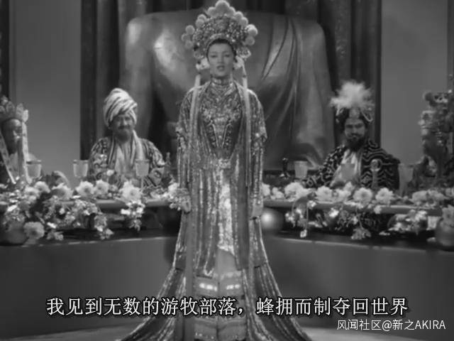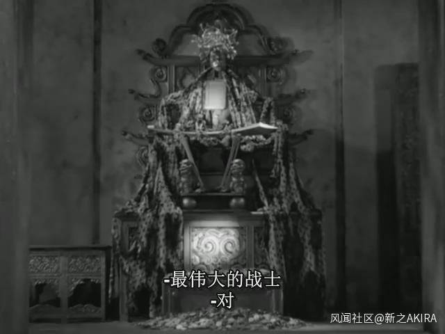於是偉大的成吉思汗頭頂一個類似唱京劇的帽子,披着披風,戴着傳説中的面具,手拿傳説中的寶刀,就那麼端坐於寶座之上: