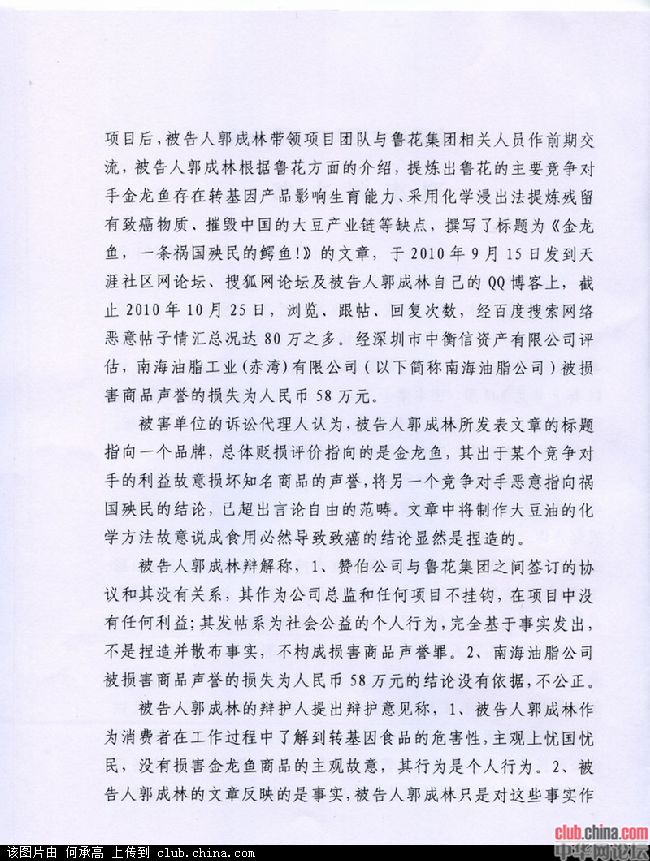 此外,庭審期間,郭成林還供稱:其在接取項目後及與魯花公司交流過程中,對轉基因、化學浸出法有所瞭解,也因此得知金龍魚產品存在的問題,並對金龍魚的所作所為感到憤慨,於是在網上發帖予以揭露,其所寫的文章並非在他人授意下形成,與自己所在公司無關。但其對文章內容的真實性和可靠性並沒有經過詳細論證。