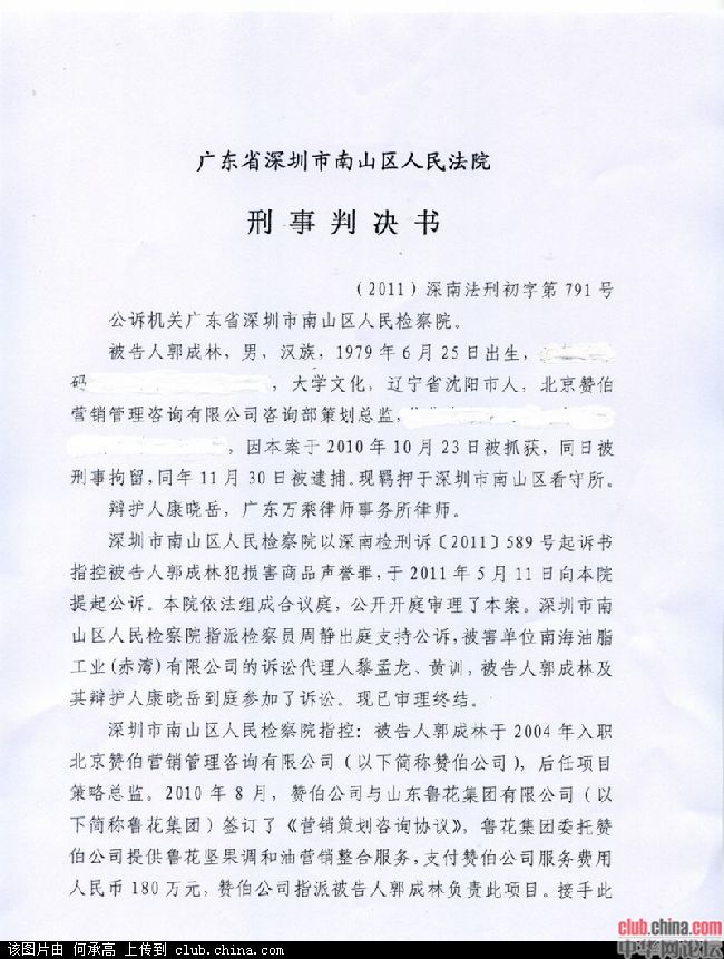 郭成林供稱,其系贊伯公司項目策略總監,贊伯公司受魯花集團委託做市場營銷策劃項目,其是該項目負責人。2010 年9 月15 日,其通過辦公電腦在天涯社區網論壇、搜狐網論壇及其00 博客上發表了《金龍魚,一條禍國殃民的鱷魚!》 的文章。在天涯社區網發帖時用的是2010 年7 月臨時註冊的1D : mimidianhua, 註冊時只留了自己所用的郵箱:[email protected]。