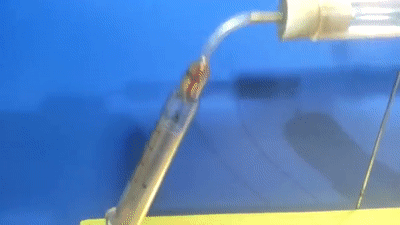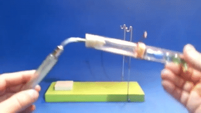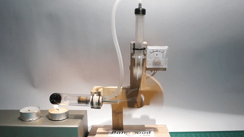 在我們的彈珠斯特林發動機裏,加熱試管的屁股時,氣體膨脹,順着吸管來到了針筒裏,多餘的空氣推動針筒變高,拉動試管。