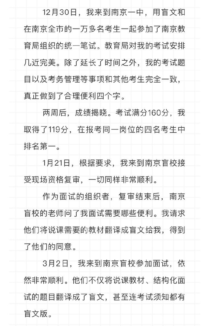 盲校的數量比普通高中要少得多,他在極其稀少的招聘中終於發現了一個自己可以投遞的崗位,南京市盲校高中政治崗位——但是身體條件這塊仍舊不匹配。他報名後就被直接打電話通知無法參加考試。