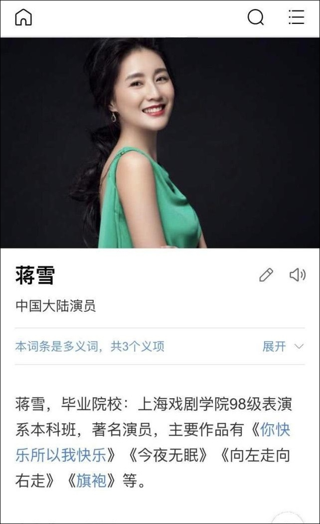 公開資料顯示,蔣雪畢業於上海戲劇學院98級表演系本科班,現為上海話劇藝術中心演員,曾出演過多部影視作品,其中包括有《向左走向右走》的周琪、《和空姐一起的日子》中的王茜、《都市男女》中的白瑞潔等,與姚晨、陸毅、賈靜雯等一眾大牌明星有過合作。