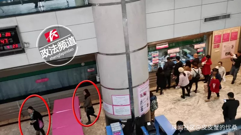 3月28日上午,這名戴着眼鏡、身穿黑色上衣的女子和另外一名身穿棕色大衣的女子,兩人一左一右、一前一後出現在門診大廳。