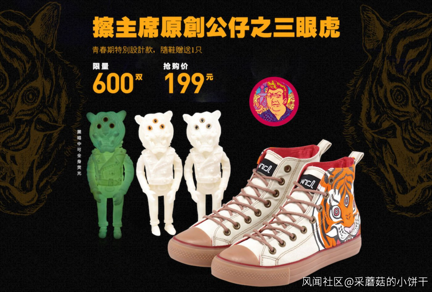 “清河聯合”品牌創始人擦主席就是較早嘗試的那批人其中之一。六年前,擦主席跨界與凡客推出了一款三眼虎圖案的帆布鞋。與鞋套裝發售的的還有一款三眼虎軟膠玩具,這就是擦主席對於玩具的第一次嘗試。