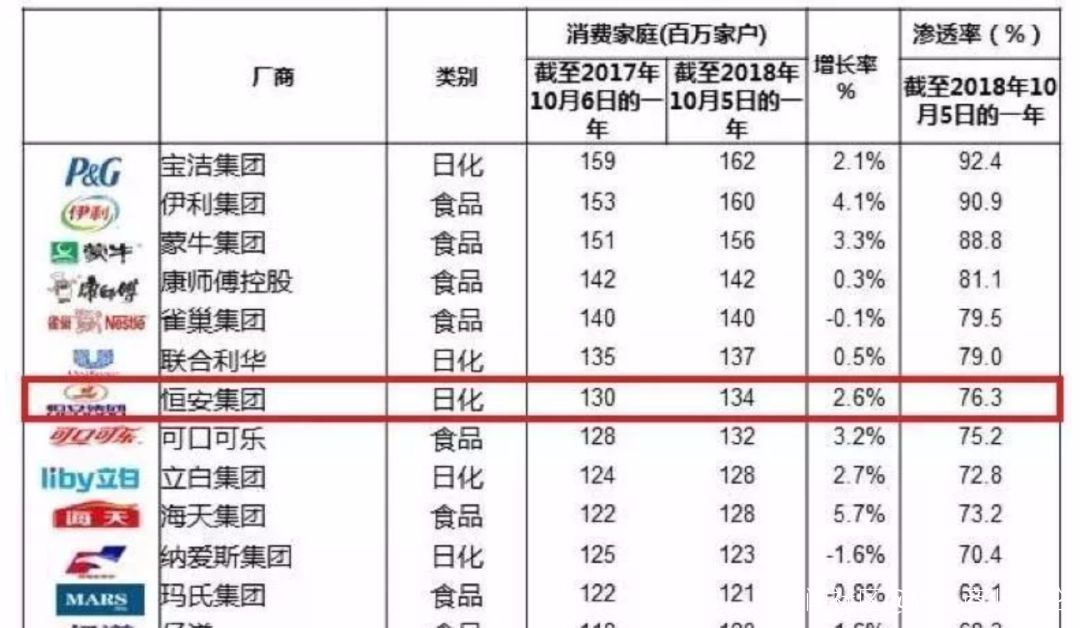 “恆安”這個名字,也許並不為很多人熟知。但如果提到心相印、七度空間、安兒樂與親親,想必大家不會陌生。凱度消費者指數最新報告顯示,截至2018年10月5日,恆安集團以整體家庭滲透率76.3%(同比增長2.6%)排名第七,甚至領先於可口可樂。換句話説用過恆安產品的人比喝過可口可樂的人還要多。