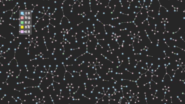 在這張來自實在智能的法律知識圖譜中,藍色的節點是法條,紅色是特徵,綠色是陳述,黃色是推斷,紫色是結果,節點之間的連接通過大量判決文書構建。