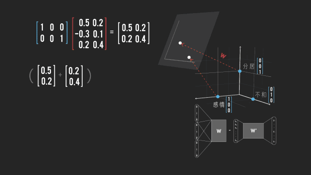 但 one-hot 向量的問題分佈過於稀疏,無法分析詞語間的聯繫,所以可以通過一個 3×2 矩陣W,把他們投影到一個二維座標系,「感情」和「分居」的位置就在這裏。