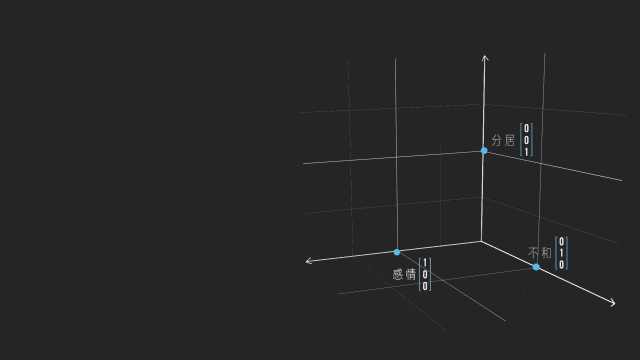 以婚姻法第三十二條中的這句話(因感情不和分居滿二年)為例,「感情」「不和」「分居」都可以表示為一個在三維空間中的 one-hot 向量, [1,0,0],[0,1,0,],[0,0,1,]。