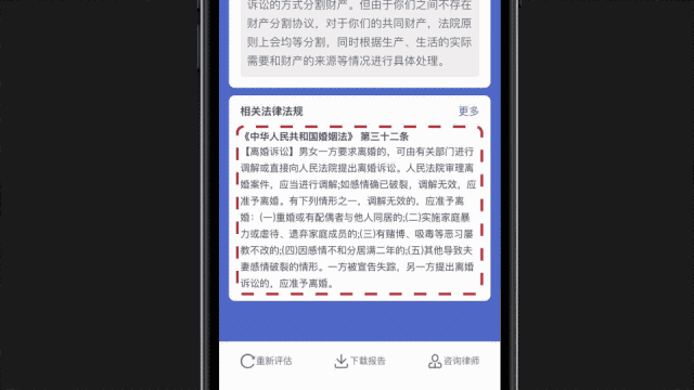 我們找到了一家 AI 創業公司——實在智能,他們開發的小程序「包小黑」能根據你描述的離婚訴求輸出一份包含勝訴概率,關鍵法條、同類判例在內的評估報告。