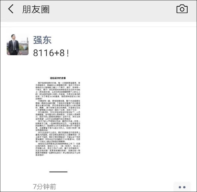 京東還遠談不上成功,我們的國家還不是世界上最強大的國家,我們還有很多貧困人口需要幫助!天上掉不下餡餅,我們只有拼搏奮進!才能讓這個世界更加美好!京東永遠不會強制員工995或者996,但是每一個京東人都必須具備拼搏精神!|我現在無法再像創業初期那樣拼命工作了!但是以我的體質,做到811648,(週一到週六,早8點工作到晚11點,週日工作8個小時,每個月休假兩天,每年也會休一次長假)完全沒有問題!我享受拼搏的快感!我要找到一幫願意為理想而一起拼的兄弟們!並讓他們的日子過得愈來愈好!