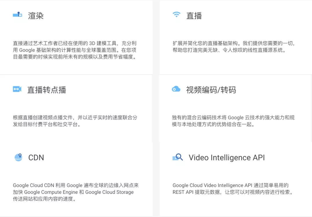 打開Google Cloud官網,就會發現Google Cloud主打的技術是渲染、直播、轉碼、剪輯、CDN這些功能上——這些更多是基本功。
