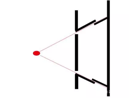 紅色圓點是光源,2條紅色光線是經過篩選的,假設所有光子都不會撞擊到中間具有縫隙的隔板(可以考慮單光子發生器),並且在對面的隔板上安裝2條與光子路線平行的傾斜的阻擋隔板(為了阻擋反射的光子產生干擾),假設光子在撞擊到最終的隔板前不會與路過的任何平面發生碰撞,則干涉現象必然消失。