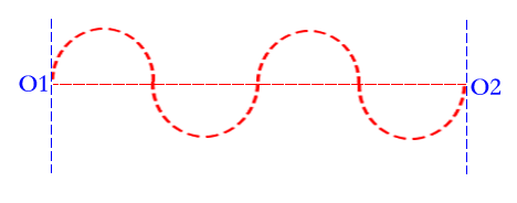 當光子進入介質後,由於介質內原子核的密度足夠大,導致光子在任何時刻都會受到來自介質中原子核的束縛力的影響,因此光子的軌跡是時刻都在改變的。假如光子的運行路線改變後是沿着S型波浪路線前進的(也可能會在原子核束縛力的影響下,沿着螺旋型路線前進),並且波浪形路線的波峯和波谷的絕對值相等或相近,此時光子的行為可以近似的認為是以橫波的方式前進的,假設此時的光子的速度並沒有改變,根據速度的分解法則可知,光子在橫波前進方向的座標軸上的速度分量很明顯是小於光速的,而這正是我們所測得的光子在介質內傳播的速度,因此,現代理論認為:光子在介質內傳播的時候,速度會降低。然而,現在經過分析我們知道了,光子的速度在介質內並沒有改變,或者説,光子在介質內並沒有因為介質的影響而改變速度,它改變的只是運行的路徑,如下圖1 – 2所示:。