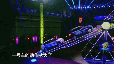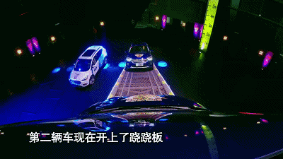 第三輛車上蹺蹺板時,第一輛車倒車,第二輛車往上開。