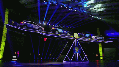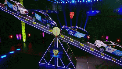 4個人駕駛4輛車平衡蹺蹺板