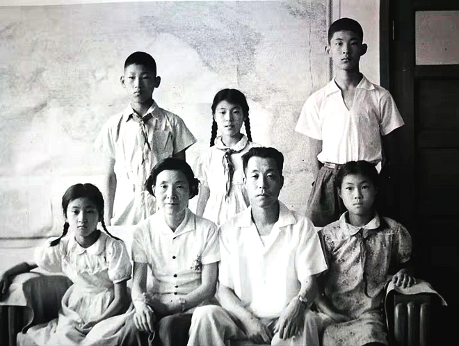 ▲1961年夏,在王府井大街人民日報社郭渭同志辦公室內,作者全家合影。第一排右二為作者父親郭渭、右三為母親李劍虹,二排中間為作者郭海燕。