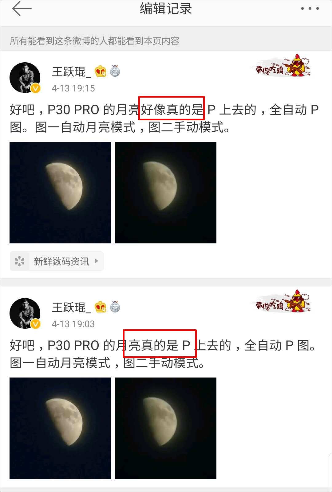 對此有網友表示,這應該是P30 Pro的AI算法對照片進行了優化,然而原博@王躍琨_ 在微博中説的是月亮是P上去的。