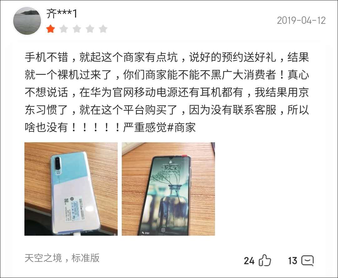 下面這位用户也提到了附帶貼膜的問題,他説“説的帶貼膜,又沒有貼膜”。在查看了華為商城P30 Pro的包裝清單後我發現,官方確實沒有在包裝盒內配有貼膜,只是配了一個TPU保護殼。