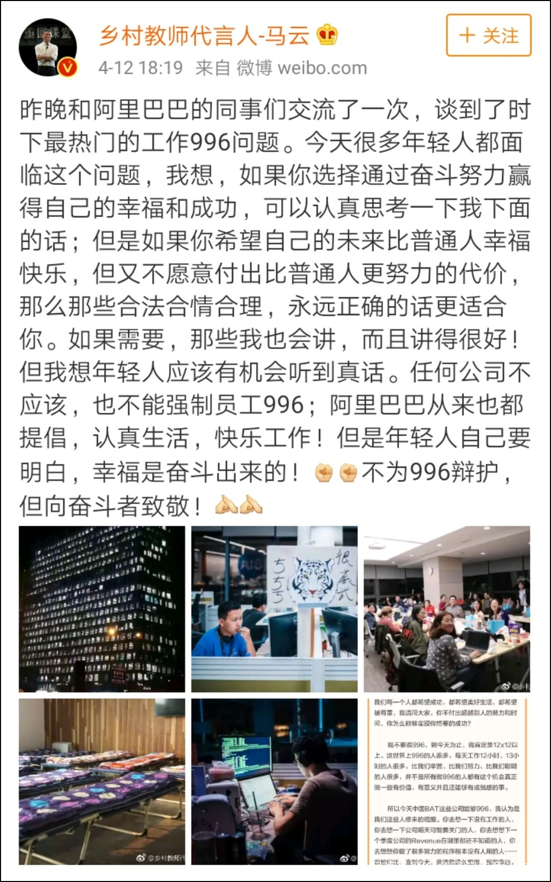 隨後馬雲又公開回應:年輕人要奮鬥,幸福是奮鬥出來的,實現理想需要付出大量的努力,並且表示不為996辯護,但向奮鬥者致敬!