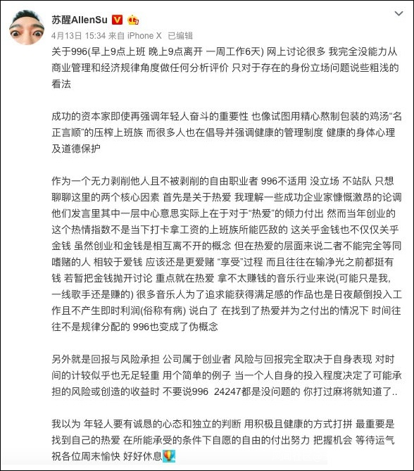 在幾位大佬發聲之後,無數的企業家、自媒體、在職員工、網名們接連發聲,加入了這一場全民大討論。996的風頭甚至蓋過了很多娛樂圈熱門話題的熱度,這不,作為娛樂圈的代表,一向愛發言的甦醒同學也站了出來,表達了自己的見解:他認為資本家強調奮鬥有對年輕人洗腦的意思。